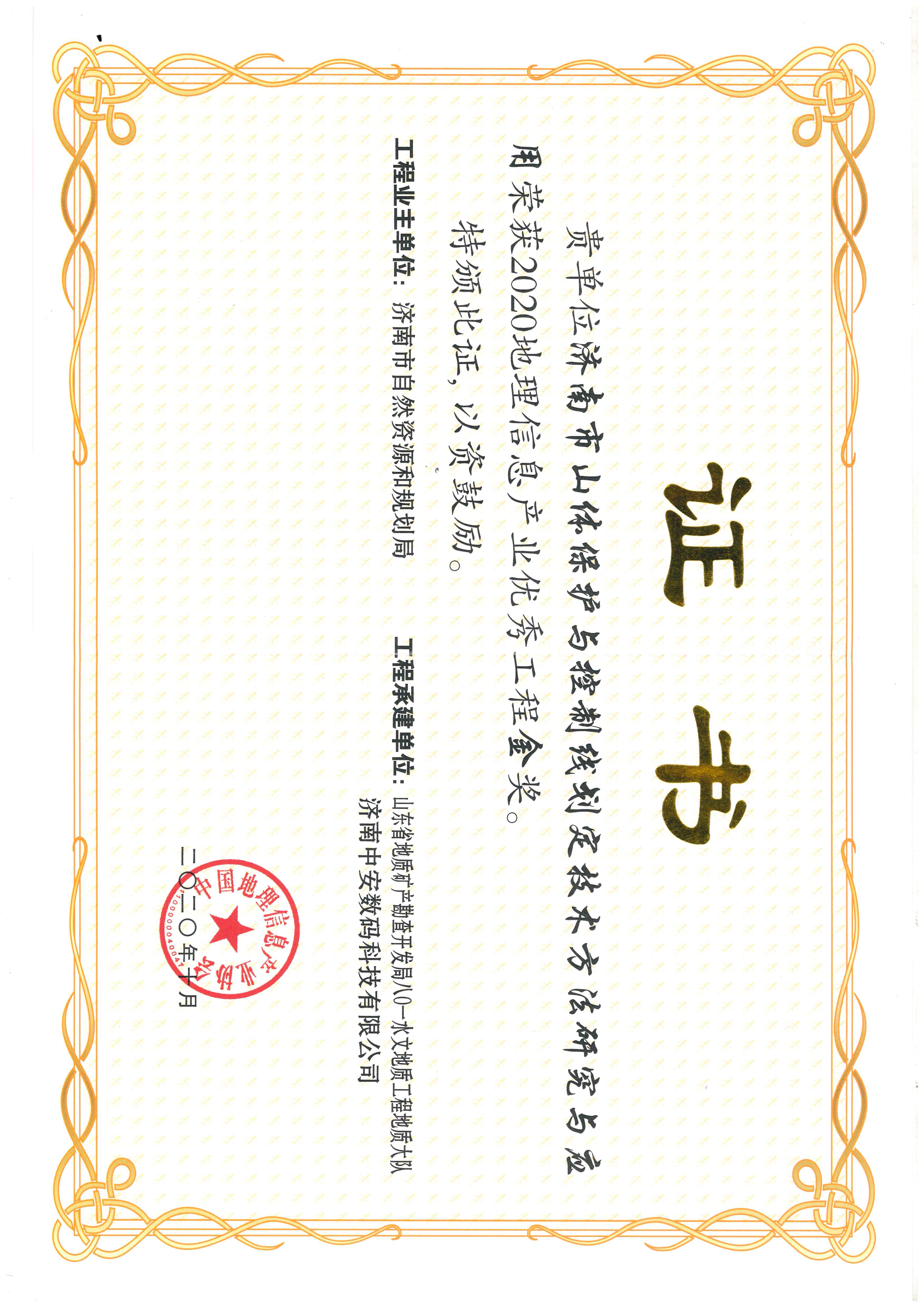 2020年優(yōu)秀工程金獎 地理信息科技進(jìn)步獎證書(shū)